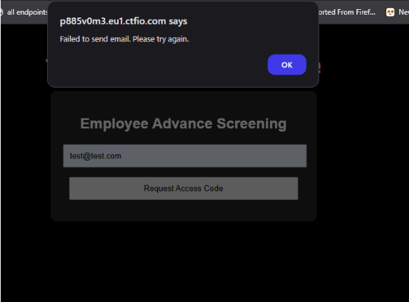 Notice the email request failed to send to the email of test@test.com but there is no error saying what email types are allowed. lets see in our proxy if there a request about the failed request for access code.
