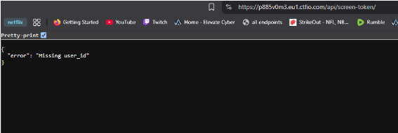 we open the endpoint on our browser see that we get this error which is show in the image. We need to add this format of json with id value to get something in return. lets switch to our proxy to see if we get a user id info.